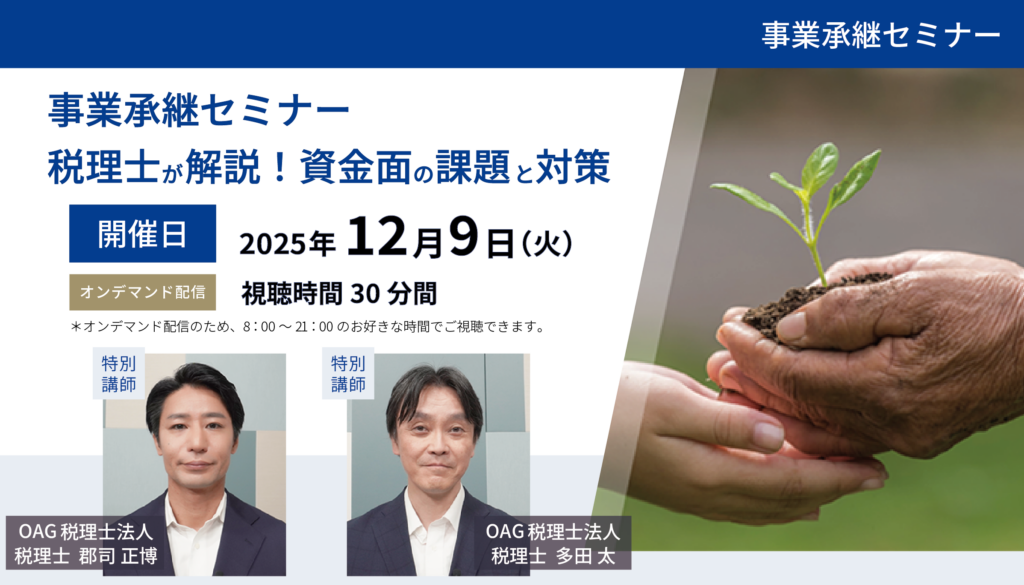 本セミナーでは、事業承継の課題である自社株承継や相続税資金確保の対策について、年間300件の相談実績を持つOAG税理士法人の税理士が登壇し、わかりやすく解説します。